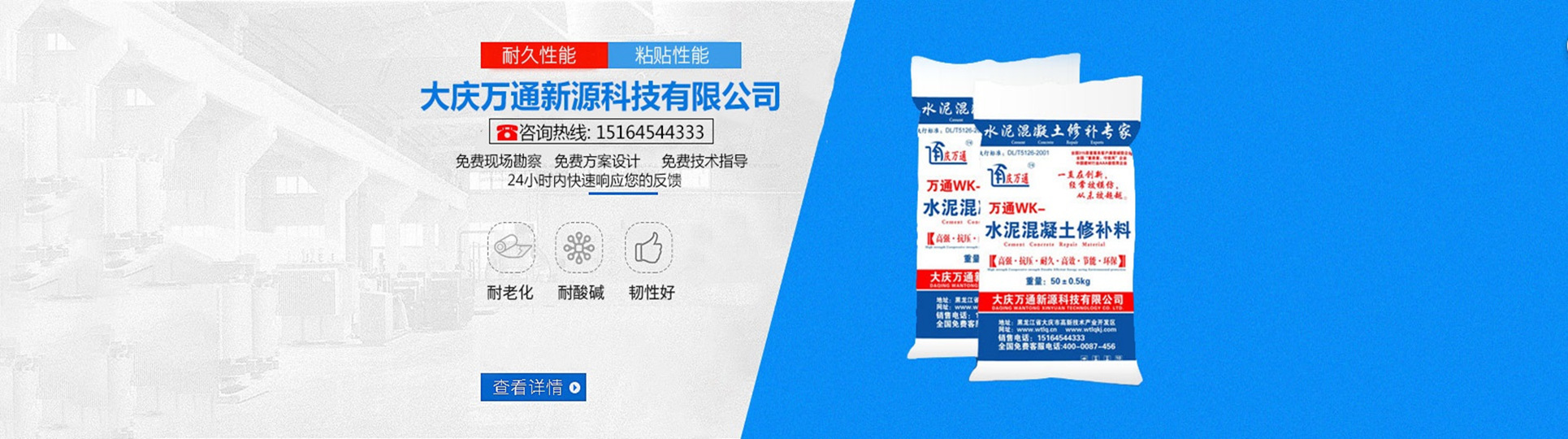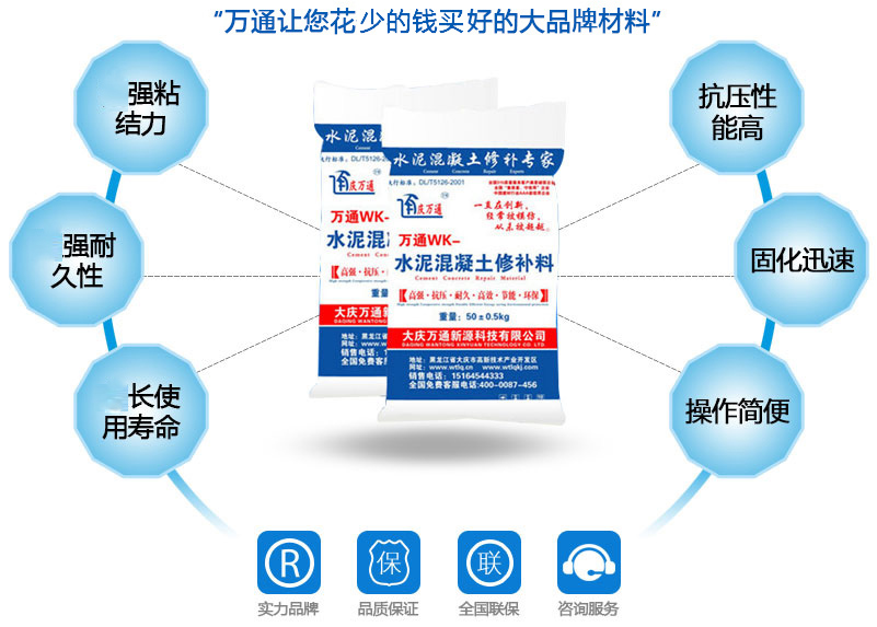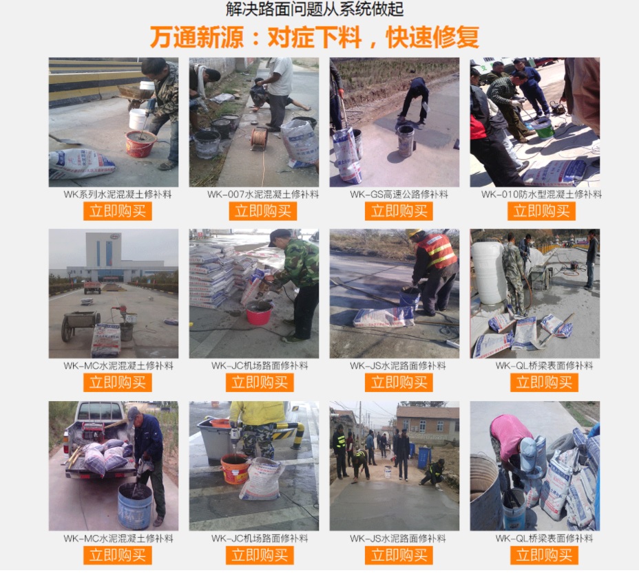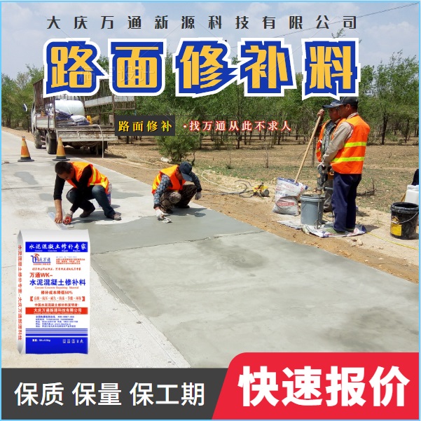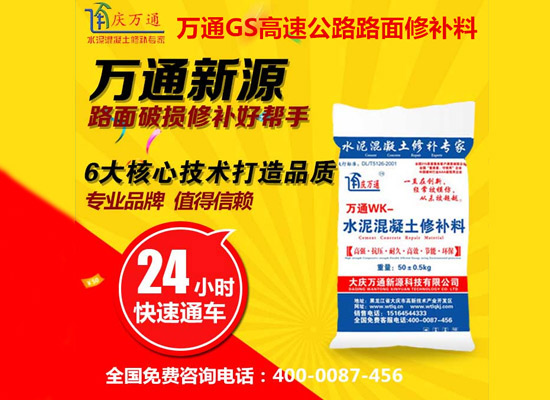 大慶萬通新源科技有限公司獨有的混凝土路面高強(qiáng)速補料,是水泥混凝土路面病害修復(fù)的好材料。疲勞、凍融循環(huán)、彎曲壓力、滲水和基層破壞等原因都會引起水泥路面的破損,從而帶來高昂的維護(hù)費用。與以往的剛性修補方法不同,混凝土水泥路面維修速補膠提供了一種獨特的柔性修補產(chǎn)品和技術(shù),高柔性、高抗拉性,可跨伸縮縫施工和高抗壓性使得混凝土快補產(chǎn)品為水泥混凝土路面提供了******性的修補。傳統(tǒng)的剛性修補方案,如環(huán)氧砂漿和快干水泥產(chǎn)品,由于其自身的粘結(jié)失效,抗疲勞性低以及與原路面不同的伸縮系數(shù),修補面會在短時間內(nèi)失效或產(chǎn)生新的裂縫,需要反復(fù)修補,有效期短且費用高昂。大慶萬通新源科技有限公司的混凝土水泥路面維修速補膠可以隨原路面一起伸縮,移動,從而避免了粘結(jié)失效和產(chǎn)生新裂縫。萬通快補產(chǎn)品優(yōu)異的粘結(jié)性、柔韌性和高防滑性,特別適用于水泥路面的淺層粘合修補,多邊角混凝土板層修補,跨伸縮縫修補以及路面沉陷修補。萬通混凝土病害修補料針對混凝土起皮起沙、斷板裂縫、蜂窩麻面、坑槽露石子、漏筋掉皮、橋梁的掉皮漏筋快速通車使用時間長。應(yīng)用萬通快補產(chǎn)品,施工后一天就可以恢復(fù)交通。大慶萬通新源科技有限公司的萬通水泥路面維修速補膠適用于高速公路、機(jī)場路面、農(nóng)村村村通路面、廠坪、學(xué)校操場、市區(qū)公路、小區(qū)路面、橋梁、水泥路面的修補。使用萬通特快補材料修補路面可以一勞永逸! 水泥地面起砂怎么辦,混凝土修補劑混凝土地面起砂,混凝土地面修補,地面起砂怎么辦,
